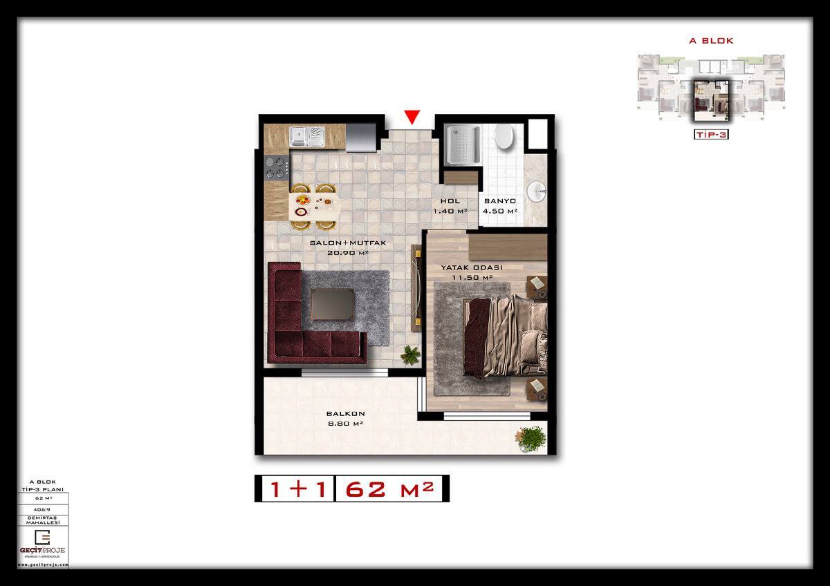Площадь апартаментов: 1+1 от 60 до 69 кв.м.